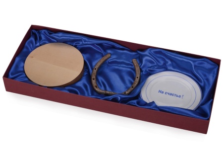 В набор входят: кусок дерева, для того чтобы постучать по деревянному и отвести неприятности, настоящая подкова победителя скачек, тарелка На счастье