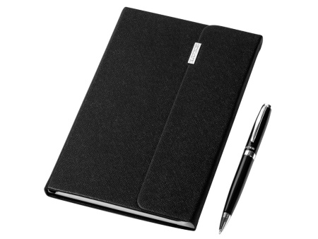 Эксклюзивный блокнот формата A5 с обложкой из термополиуретана, черной лентой-закладкой, застежкой на магните и 80 линованными листами (80 г/м²) кремового цвета. Предлагается с шариковой ручкой.
