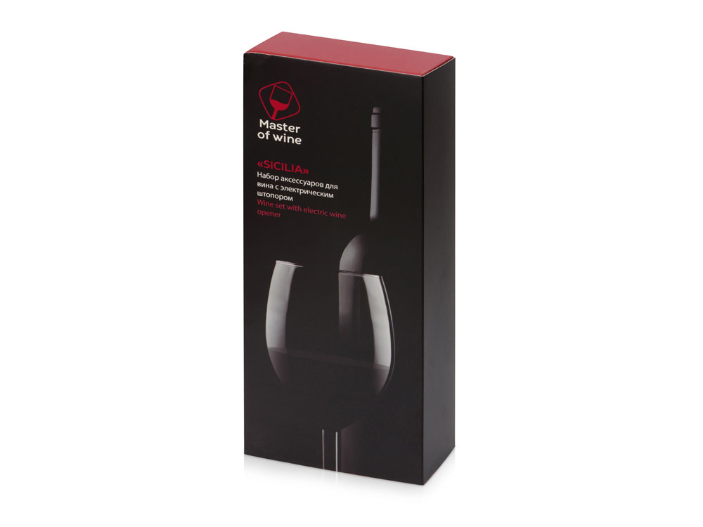 Набор Sicilia от Master of Wine состоит из электрического штопора из нержавеющей стали, пробки для вина, аэратора и ножа для фольги — с ним вы сможете откупорить вино и подготовить его к употреблению наилучшим образом.