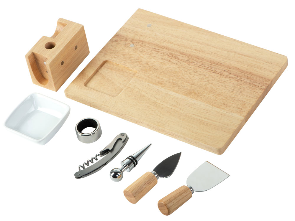 Блок с принадлежностями для сыра и вина легко можно снять при необходимости, ведь он крепится к доске при помощи магнитов. Ножи фиксируются к широкой грани этого блока при помощи магнитов, штопор — на узкой, ему отведена отдельная вырубленная ниша, что обеспечивает быстрый и удобный доступ к этим инструментам и предотвращает ржавение благодаря конструкции держателей. Для кольца и пробки предусмотрены вырубленные по форме каждого из приспособлений пазы, причем кольцо тоже имеет фиксирующий магнит.