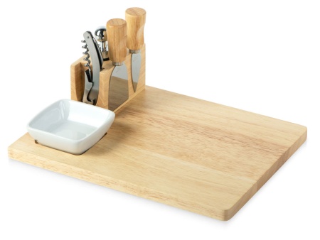 Штопор оснащен ножом для срезания фольги. Фарфоровая емкость предназначена для соуса, подачи закусок или оливок, имеет свое посадочное углубление на доске.
