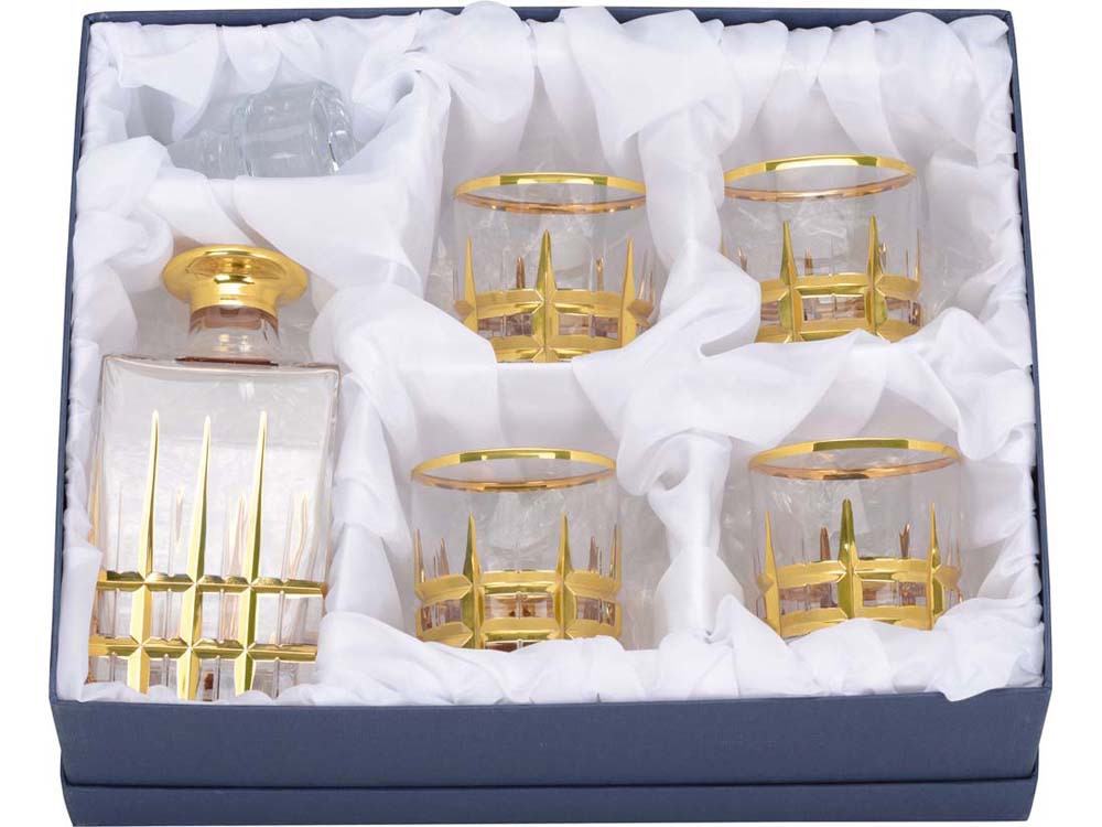 Изысканный хрустальный набор включает в себя графин и 4 бокала. Набор обладает привлекательным внешним видом. Благодаря набору вы сможете принимать решения и обсуждать сделки с партнерами в неформальной обстановке.