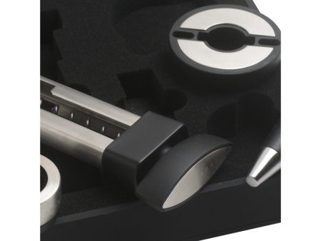 Набор поставляется в фирменной подарочной черной коробке на магнитном клапане и с ложементом, на котором под каждое приспособление вырублена ниша. Сертификат подлинности приложен к каждому комплекту.