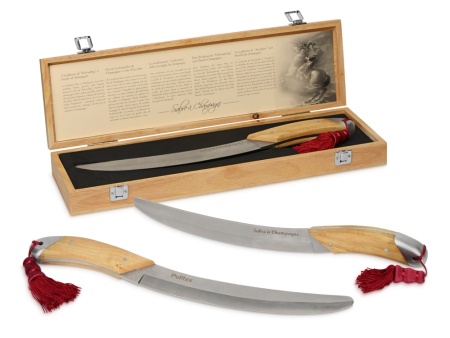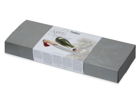 Сабраж — это необычный и очень зрелищный способ открывания шампанского, при котором горлышко бутылки не откупоривается, а сбивается вместе с пробкой. Сабля для сабража от Pulltex, испанского производителя аксессуаров для вина, создана специально для этой цели с учетом всех особенностей процесса: удобная ручка, плоское лезвие, изогнутое специально под горлышко. Рукоять выполнена из дерева, благодаря чему обеспечивается удобный хват, а кисть бордового цвета и нарядный деревянный футляр дополняют саблю, придавая ее облику торжественность.
