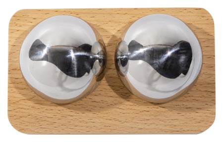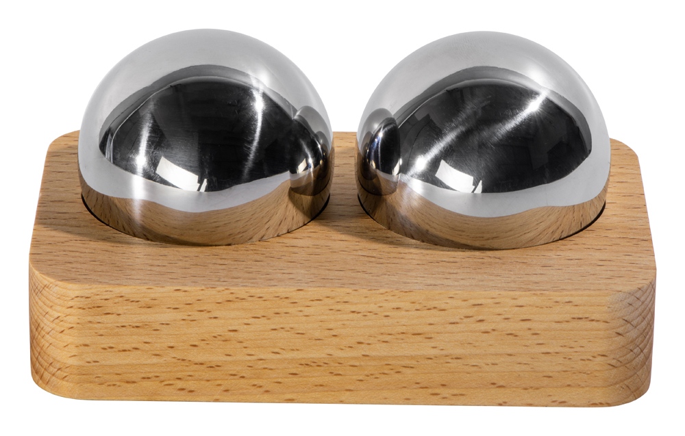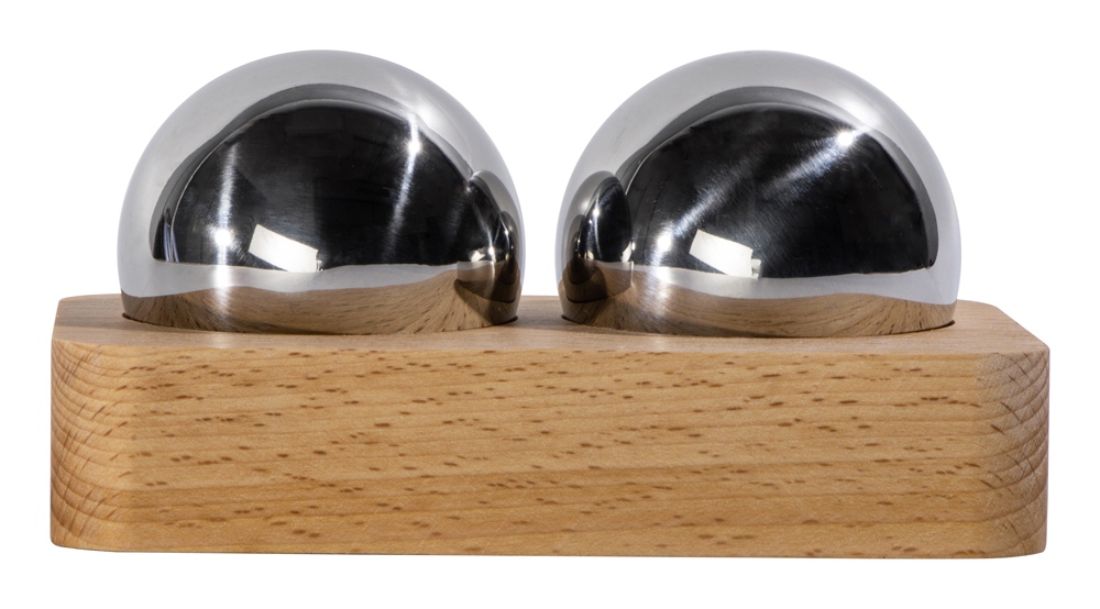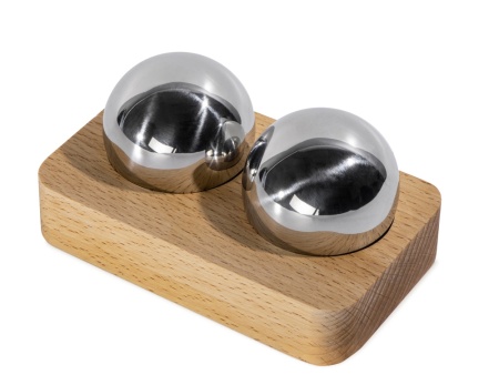 Набор состоит из двух сфер, выполненных из нержавеющей стали, и подставки из дерева, которая позволяет хранить их надлежащим образом и не дает укатываться с полки.
