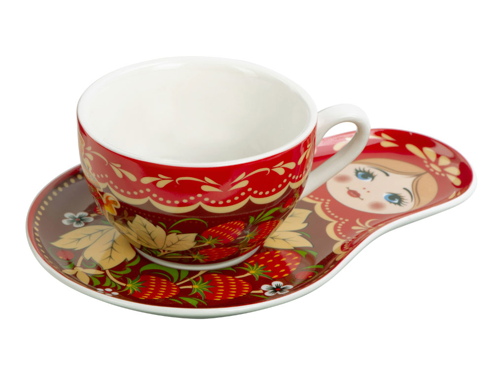 В наборе вы найдете необычную чайно-кофейную пару с подставкой в виде русской Матрешки, которая является одним из главных символов России и варенье из ели и мяты.