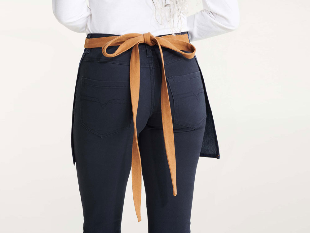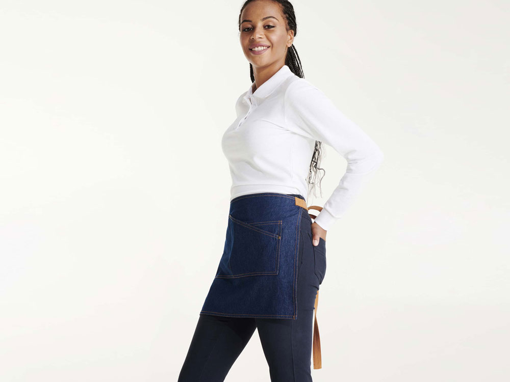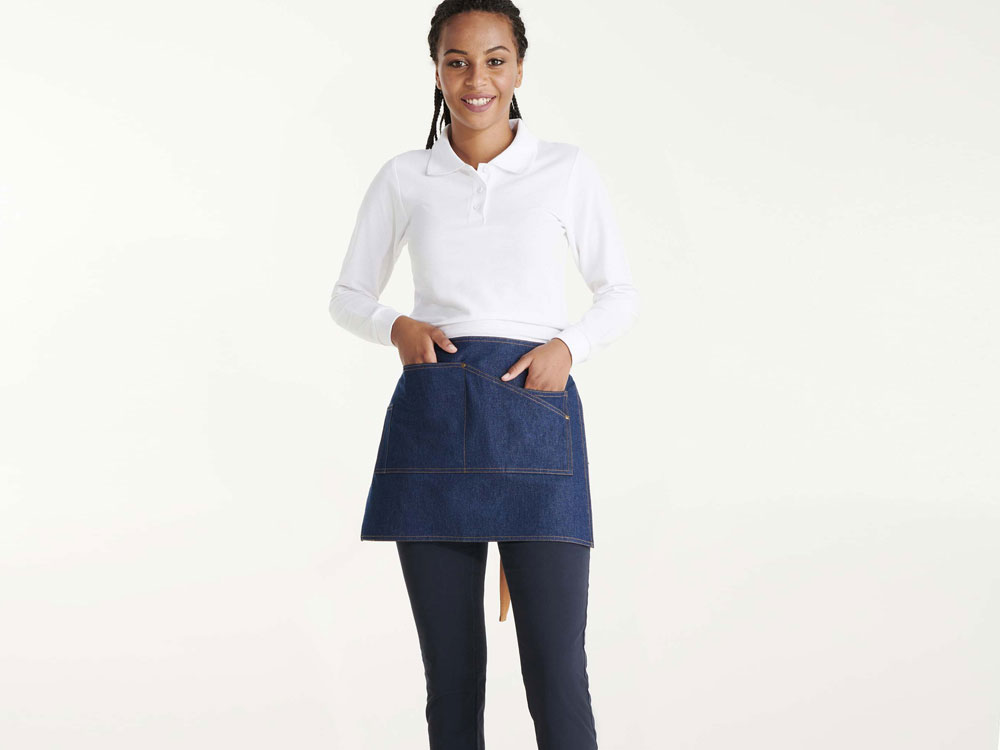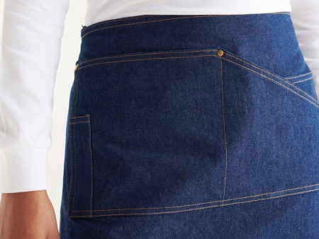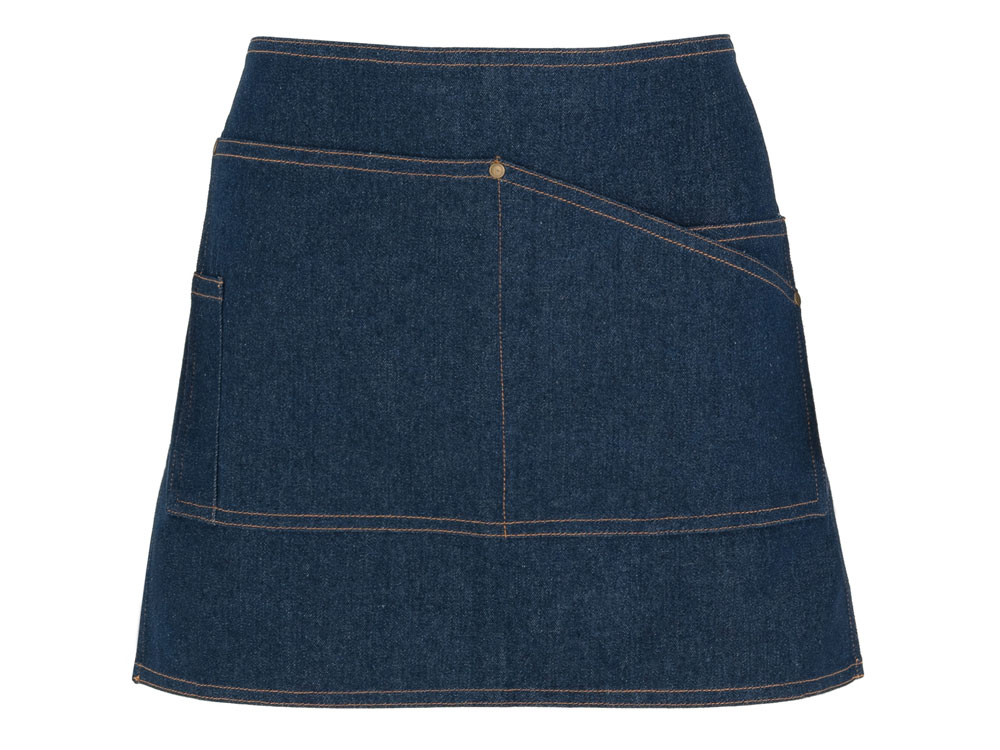 Фартук Dacosta - стильное решение в мини-варианте. Выполнен из джинсы, имеет контрастные завязки на поясе, контрастную строчку и четыре удобных кармана с заклепками, один из которых предназначен специально для шариковой ручки.