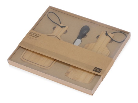 Набор для сыра и тапасов состоит из двух небольших досок и ножа для сыра. Доски изготовлены из натурального бамбука. Они имеют разную форму, что особенно удобно для подачи разных видов закусок, и оснащены веревочками, с помощью которых их можно повесить на стену.