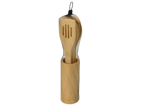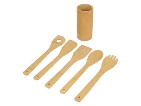 В набор входят лопатки и ложки, необходимые для приготовления различных блюд. С помощью удобной подставки из бамбука, которая идет в комплекте, принадлежности всегда будут под рукой.