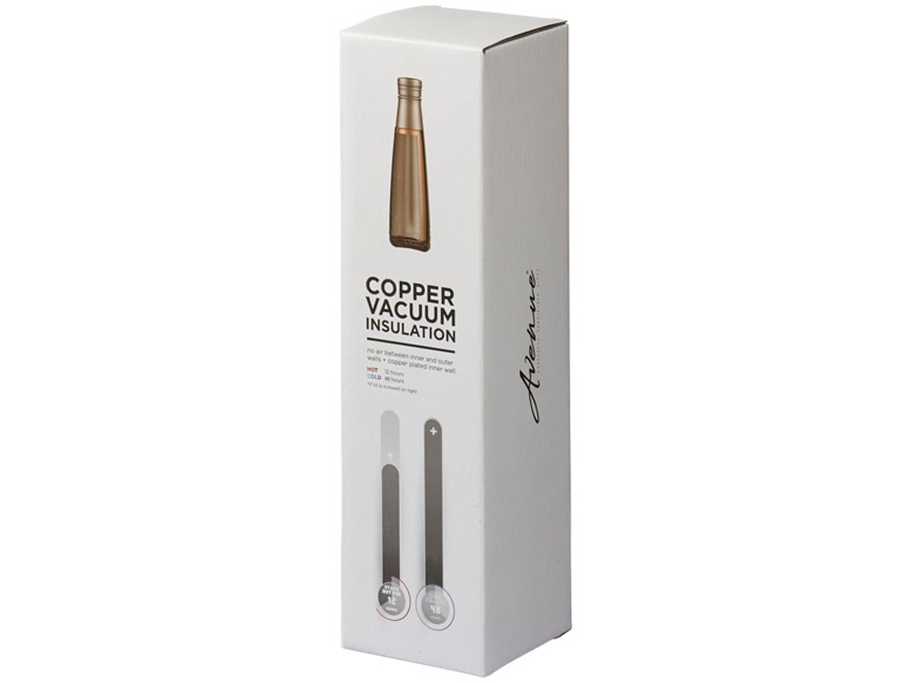 Вакуумная бутылка Duke с медным покрытием. Бутылка Duke изготовлена из нержавеющей стали (класс 18/8) с вакуумной изоляцией. Внутренняя стенка покрыта медью для достижения максимального сохранения температуры напитков: горячих до 12 часов и холодных- до 48 часов. Объем - 500 мл. Упакована в подарочную коробку Avenue. Нержавеющая сталь.