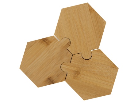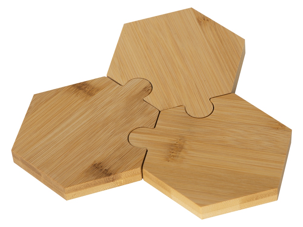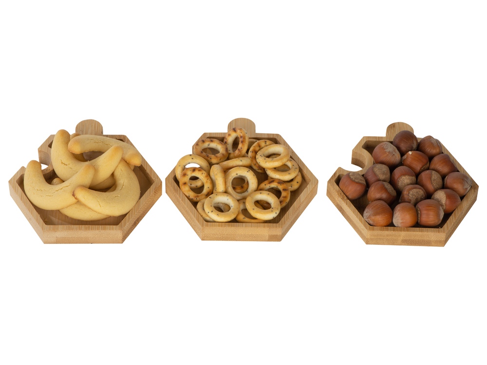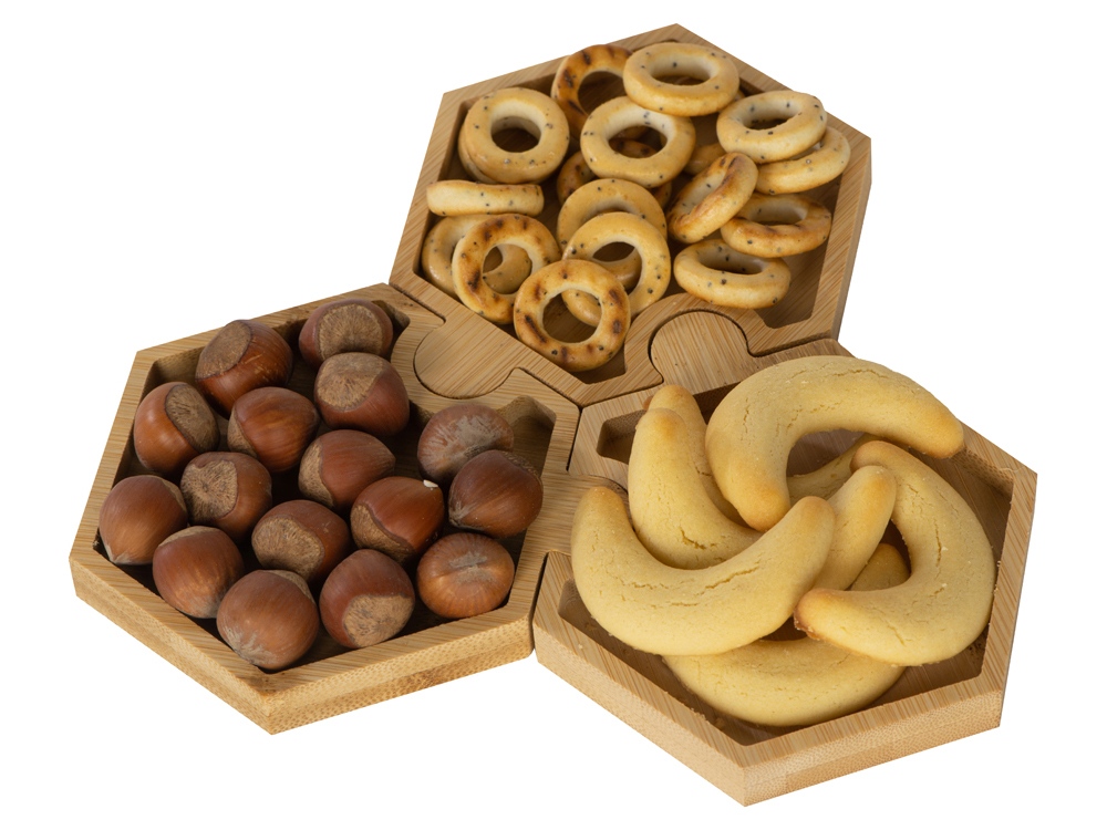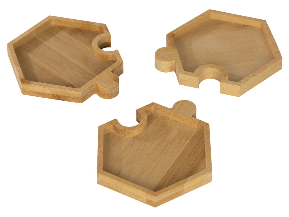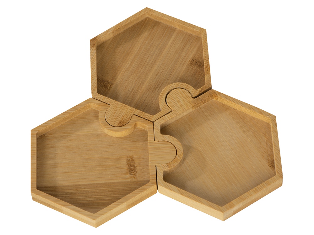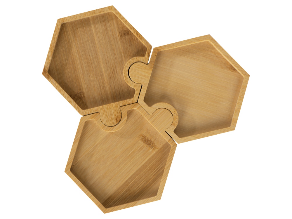 Три шестиугольных менажницы из бамбука могут использоваться как по отдельности, так и вместе, что особенно удобно при сервировке стола. Менажницы соединяются друг с другом пазами без применения каких-либо дополнительных средств.