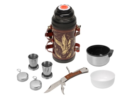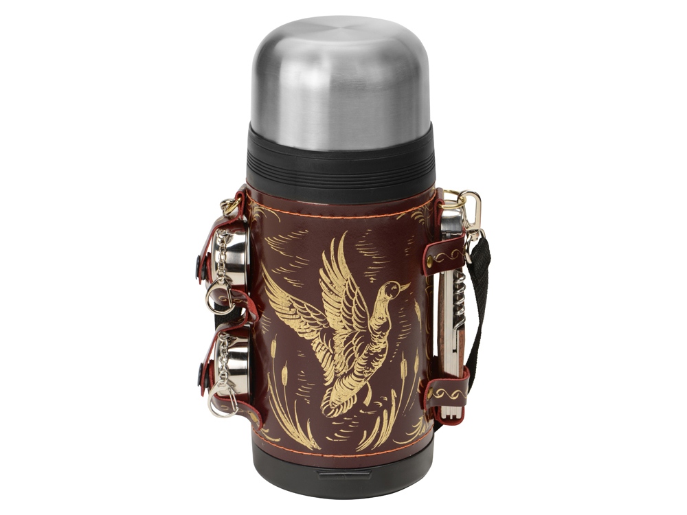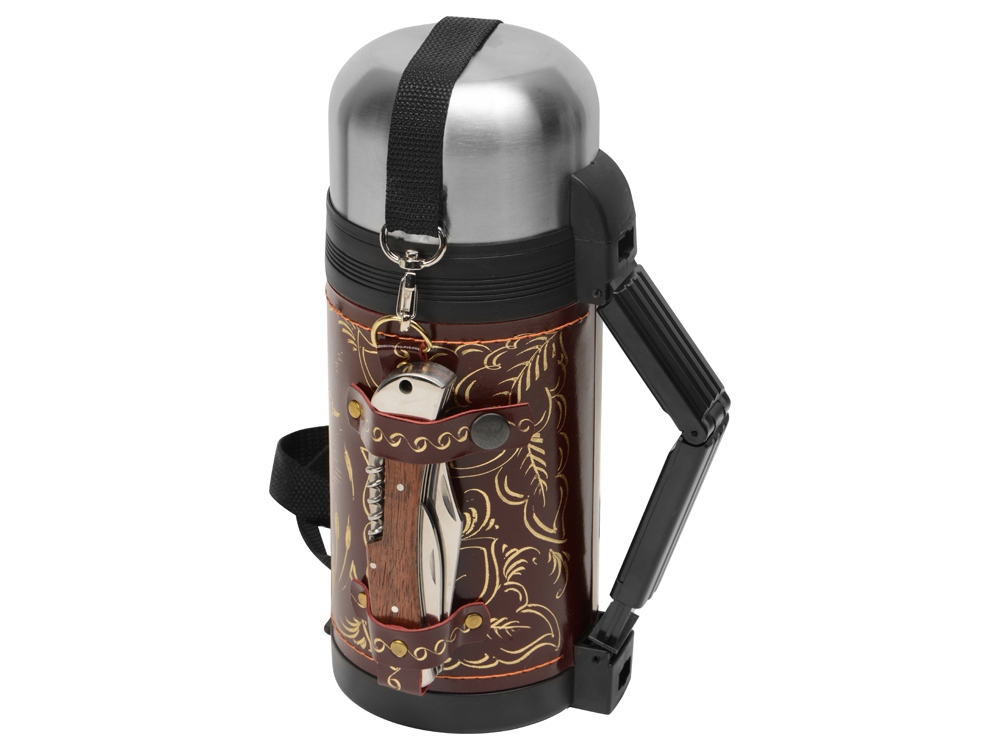 Отличный подарочный термос для дорогого вам человека! Включает в себя термос на 1,2 л в чехле из натуральной кожи с художественным выжиганием, 2 складных стакана и многофункциональный нож.