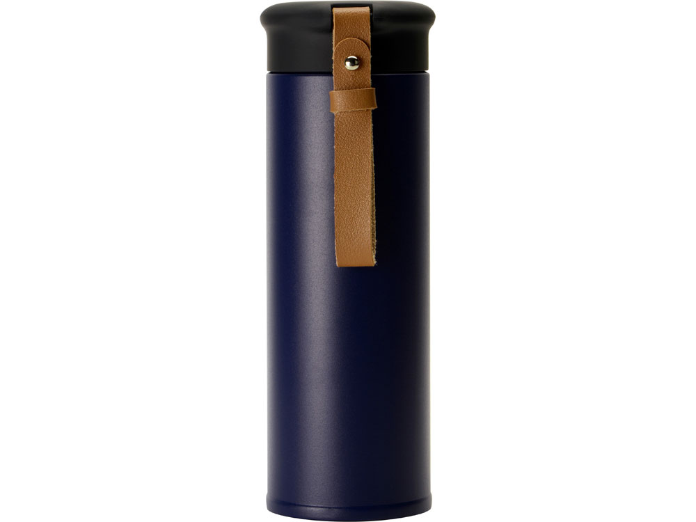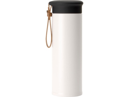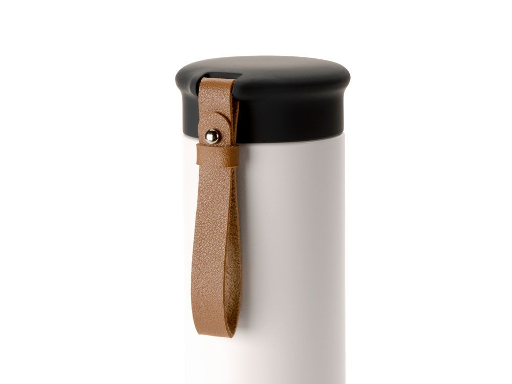 Термос герметично завинчивается на крышку, оснащенную съемным ремешком из качественной ПУ кожи. Крышка имеет прорезиненное покрытие, что создает интересное сочетание текстур в рамках одной модели. Корпус имеет элегантную рельефную поверхность с антискользящим эффектом.