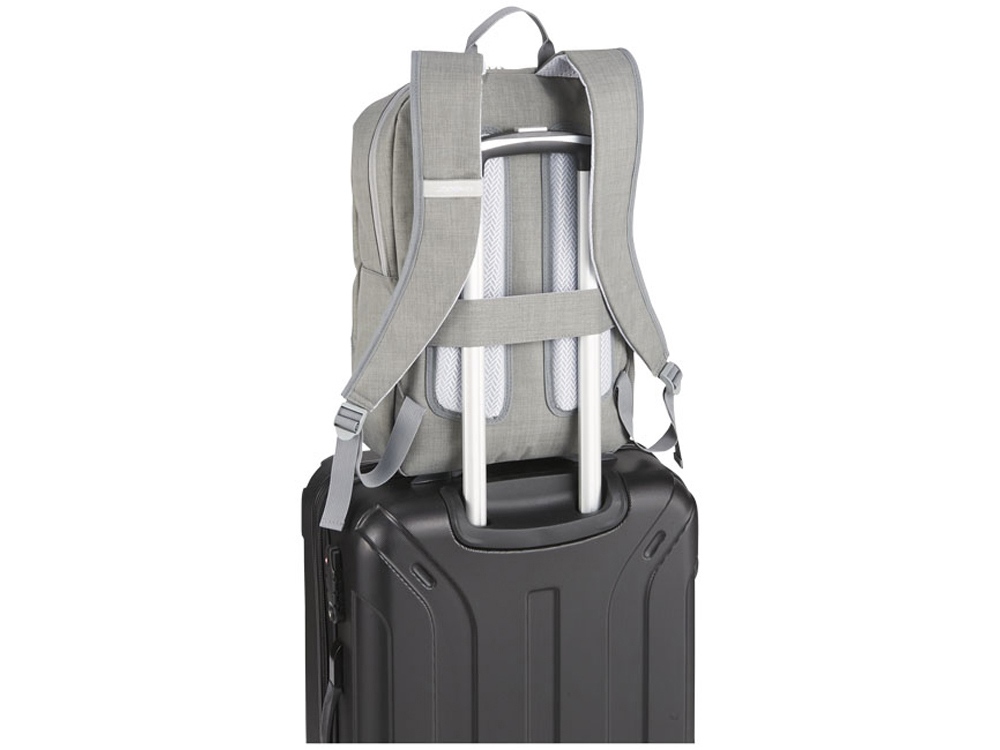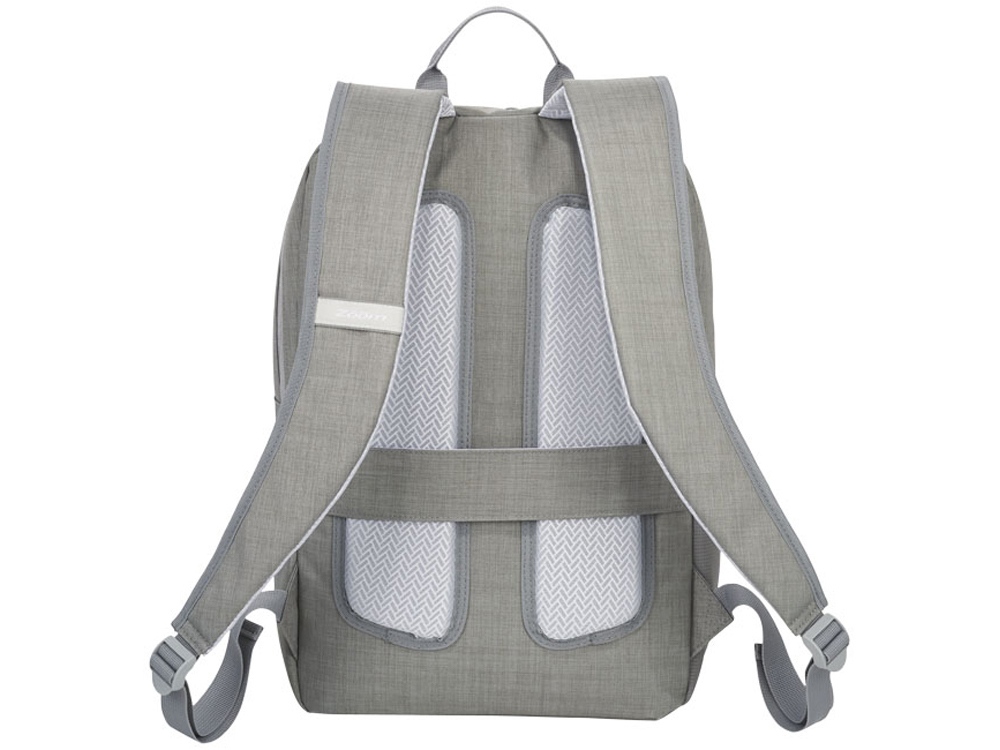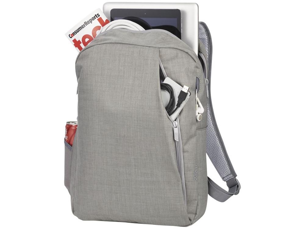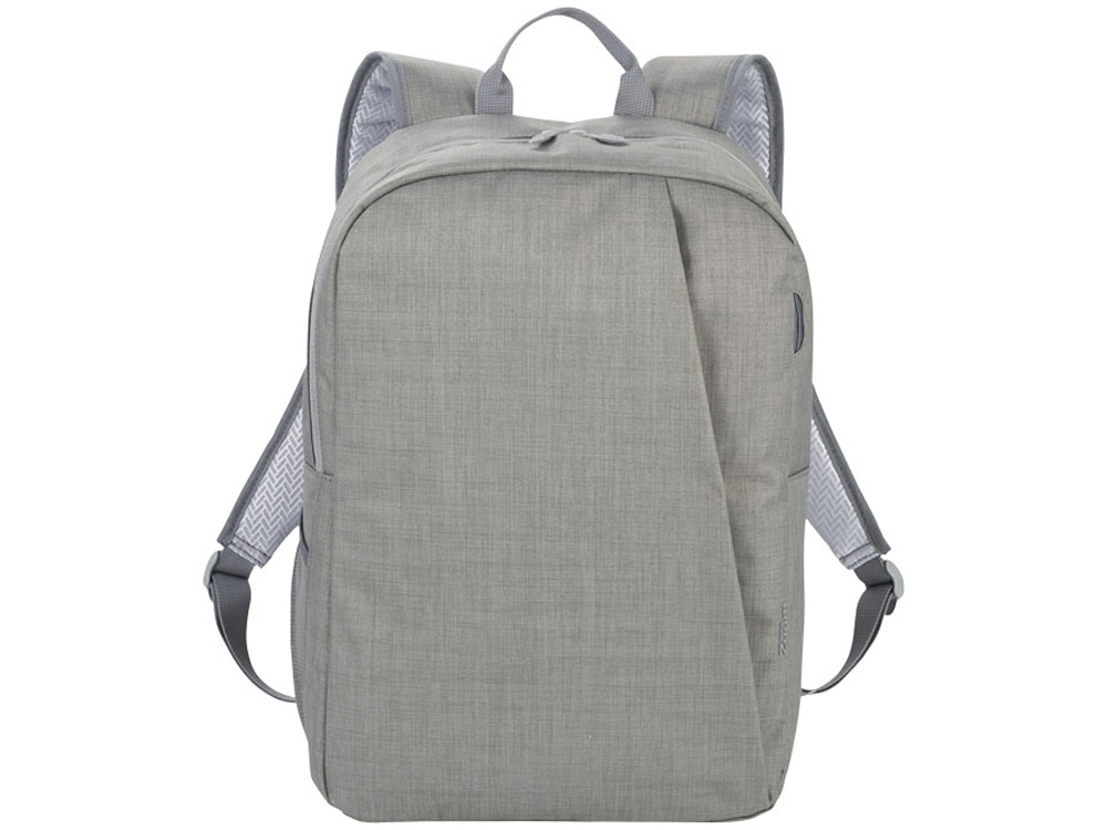 Рюкзак Zip для ноутбука 15. Гладкая ткань с серо/серебряными акцентами. Подкладка с лого Zoom® и отверстие для шнура. Основное отделение с карманом для ноутбука до 15,6. Карман из сетки и два дополнительных кармана для повербанка или телефона. Уплотненная спинка и шлейки, стропа для крепления к чемодану. Брендинг Zoom® и акценты. Полиэстер 210D.