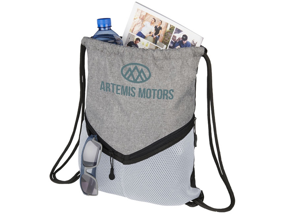 Спортивный рюкзак с застежкой на шнурке, большим основным отделением и двумя сетчатыми карманами на молнии. Сделано с прочной полиуретановой подложкой.