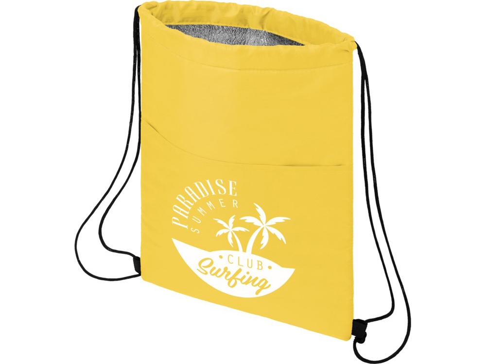 Сумка-холодильник затягивается на шнурок черного цвета. С открытым передним карманом. Вмещает 12 банок. Прочность до 5 кг.