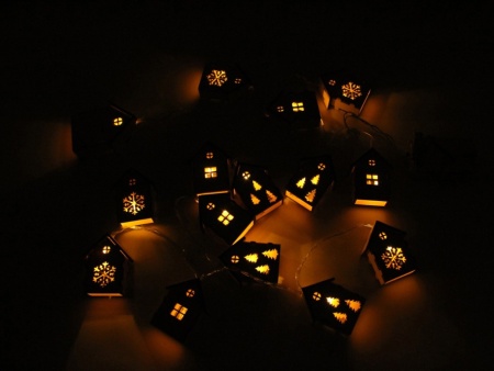 Светодиодная новогодняя елочная гирлянда постоянного свечения с домиками из натуральной березовой фанеры. Работает от 2-х батареек АА (в комплекте). Упакована в деревянную подарочную коробку со стружкой.