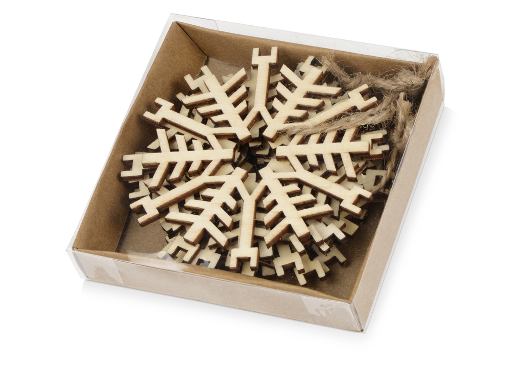 Набор оригинальных деревянных украшений в виде снежинок. Поставляются в крафт коробке с прозрачной крышкой по 6 шт.