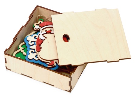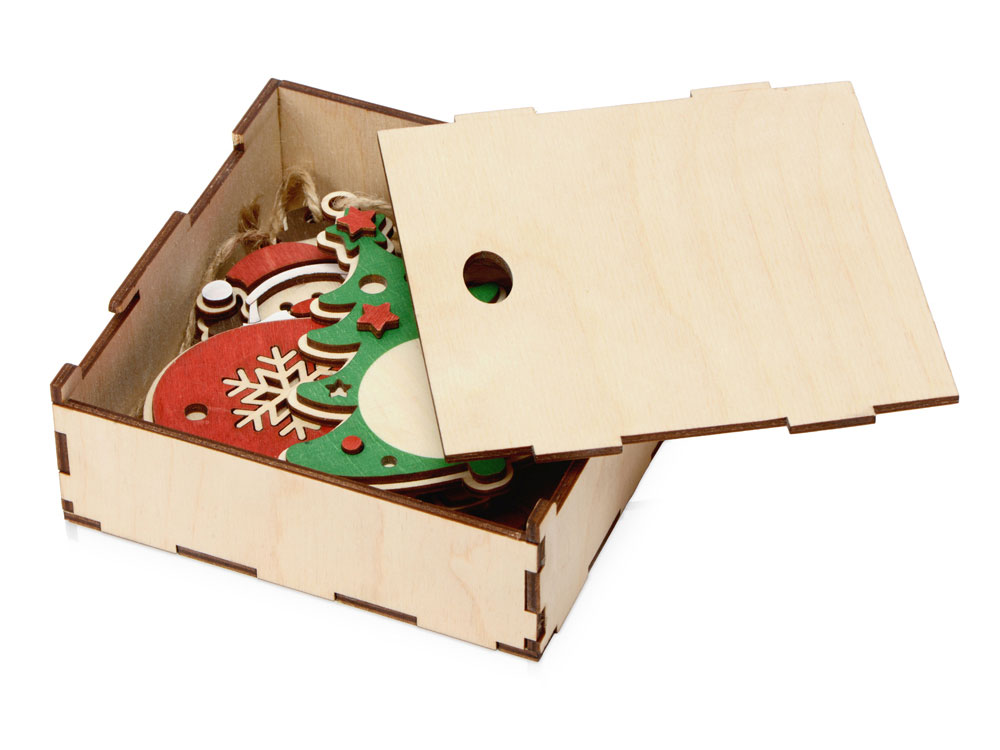 Набор из пяти новогодних подвесок упакован в коробку-футляр из березовой фанеры. Брендировать можно как сами игрушки, так и упаковку, причем помимо традиционной для фанеры гравировки предусмотрена возможность использования и других методов нанесения. Подвески будут напоминать о вашем бренде каждое рождество, создавая праздничное настроение, а футляр в дальнейшем может использоваться в качестве шкатулки для мелочей или для рукоделия.