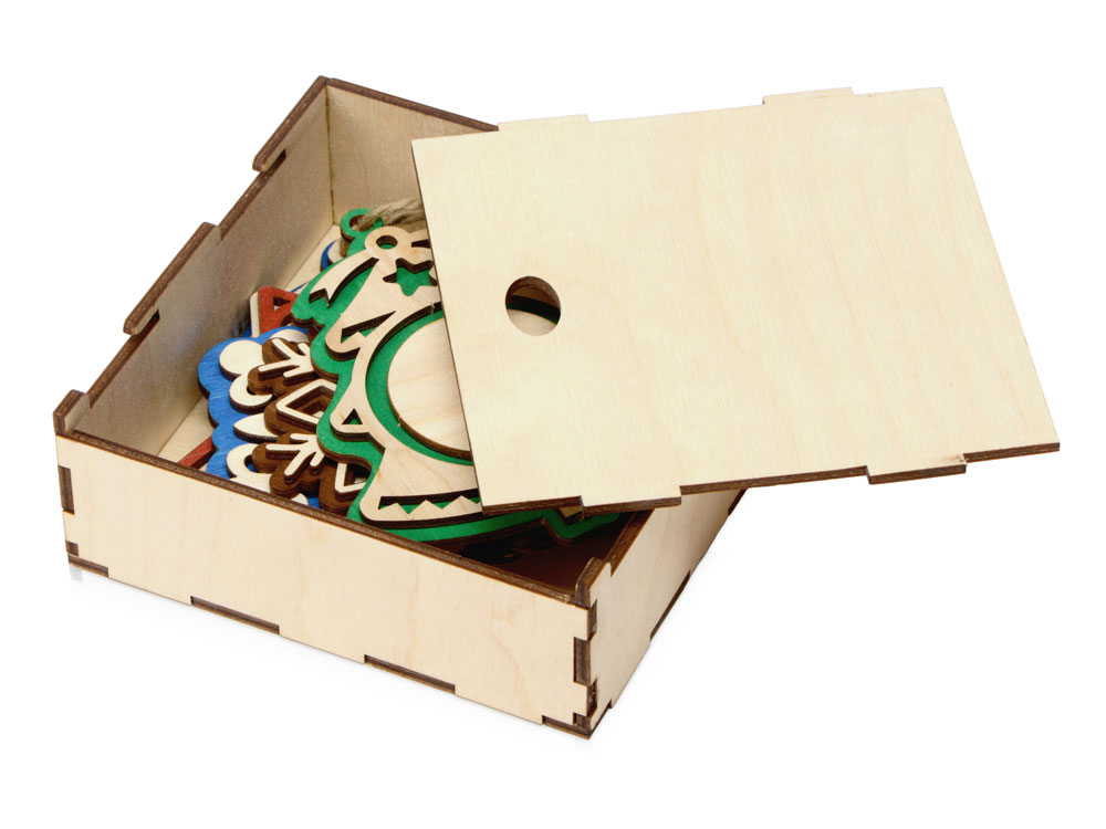 Набор из пяти новогодних подвесок упакован в коробку-футляр из березовой фанеры. Брендировать можно как сами игрушки, так и упаковку, причем помимо традиционной для фанеры гравировки предусмотрена возможность использования и других методов нанесения. Подвески будут напоминать о вашем бренде каждое рождество, создавая праздничное настроение, а футляр в дальнейшем может использоваться в качестве шкатулки для мелочей или для рукоделия.