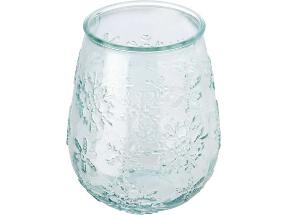 Подставка для чайной свечи из переработанного стекла с узором в виде падающих снежинок. Эта подставка создана из 1 переработанной стеклянной бутылки. Переработанное стекло не отличается ничем по качеству от обычного, но при этом является более экологичным, ведь на изготовление этого материала тратится меньше энергии, сырья и примесей. Чайная свеча не входит в комплект.