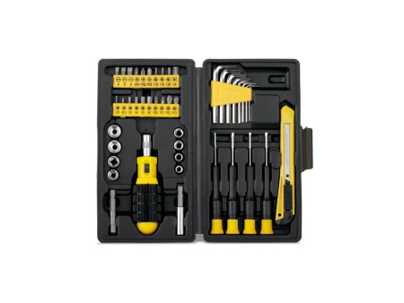 Набор из 45 инструментов из нержавеющей стали и РЕ. Поставляется в футляре. 220 x 115 x 55 мм.