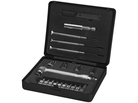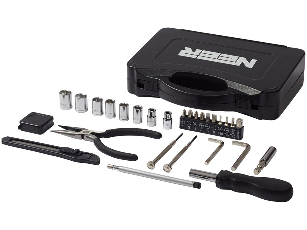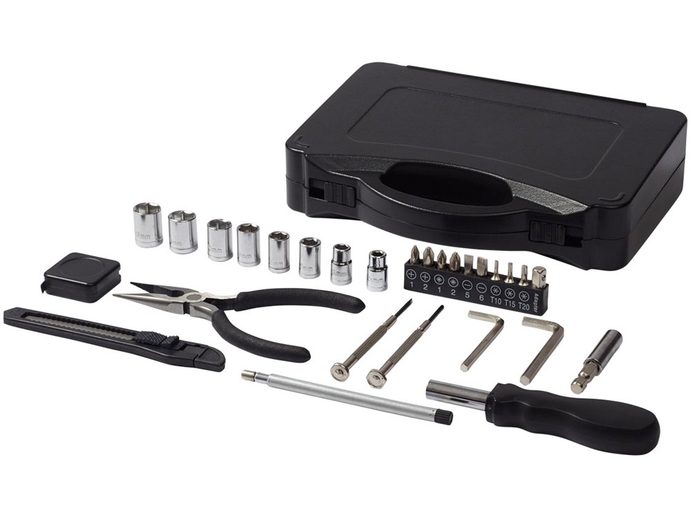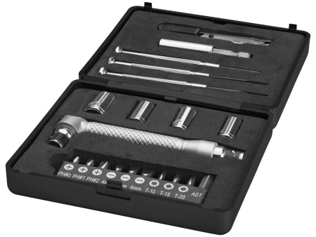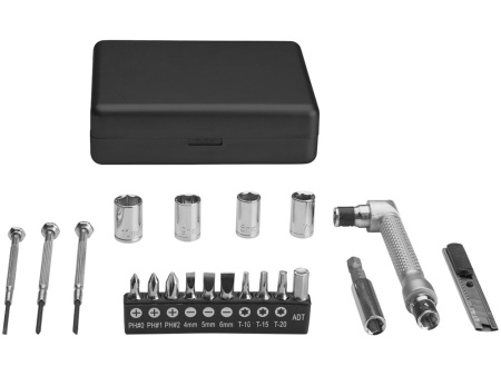 Набор инструментов 28. В набор из 28 инструментов входит ручка отвертки с 9-ю насадками (PH1, PH2, PZ1, PZ2, SL5, SL6, T10, T15, T20), адаптеры и ключи, насадки (5mm, 6mm, 7mm, 8mm, 9mm, 10mm, 11mm, 12mm), выдвижной нож инструмент, длинные плоскогубцы, телескопический магнитный инструмент, 2 шестигранных ключа (4 мм, 5мм), 2 отвертки (PH2, SL2) и рулетка. Набор упакован в коробку STAC. АБС и сталь.