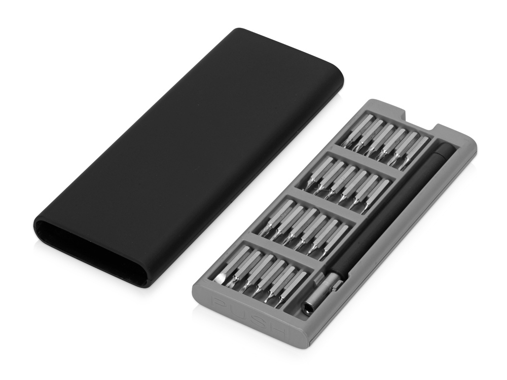 Отвертка с набором сменных насадок — лаконичная замена громоздкому комплекту отверток. 24 насадки для самых разных типов крепежа компактно хранятся в небольшом футляре, который удобно носить с собой. Замена насадки занимает считанные секунды. Минималистичный строгий дизайн превращает набор в функциональный бизнес-подарок.