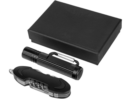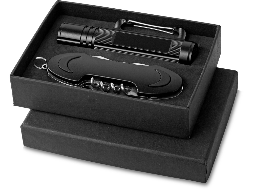 Подарочный набор Ranger с фонариком и ножом. Нож имеет 8 функций: ножницы, карманный нож, открывалка для бутылок, плоская отвертка, штопор, напильник, крестовая отвертка, консервный нож. Диодный фонарик дополнен карабином. Набор упакован в черную картонную коробку. Батарейки в комплекте.