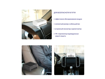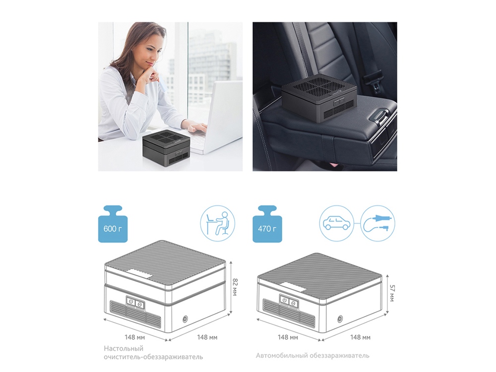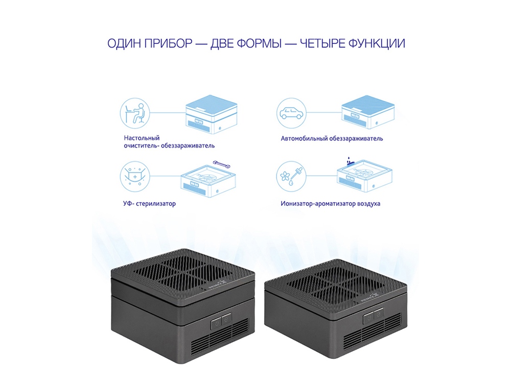 - Автомобильный обеззараживатель. Убрав модуль, содержащий НЕРА-фильтр, вы сделаете прибор более компактным и удобным для использования в машине. Автомобильный прикуриватель в комплекте.