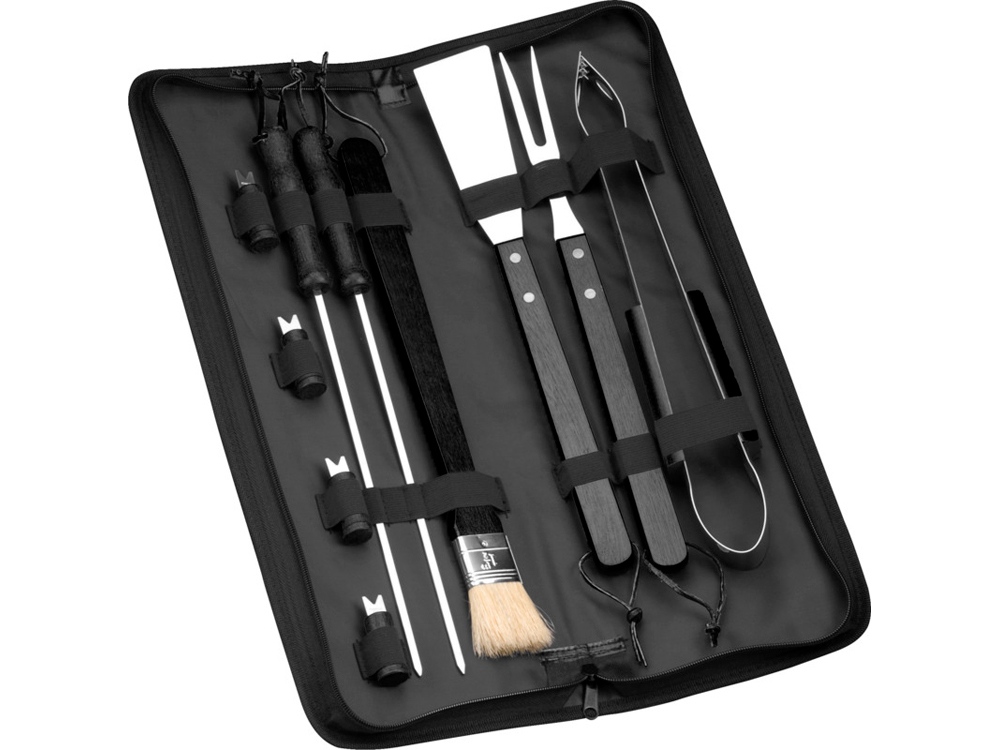 Набор для барбекю Barabicu из 10 предметов. Чехол с застежкой на молнии, передним открытым карманом и двумя ручками, включая лопатку, вилку, щипцы, 2 шампура, кухонную кисть и 4 держателя для кукурузы.