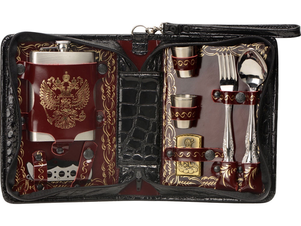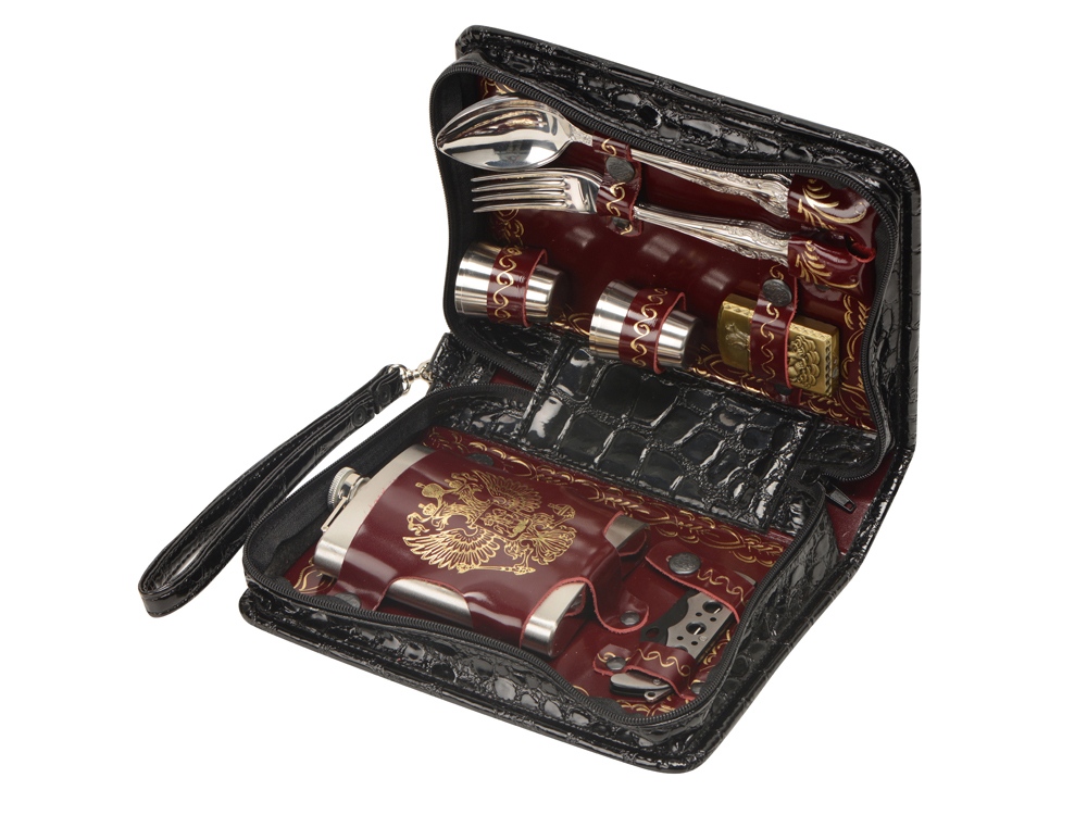 Оригинальный дорожный набор на 4 персоны в барсетке с удобным ремешком для переноски. Барсетка из искусственной кожи, отделка- натуральная кожа с художественным выжиганием.