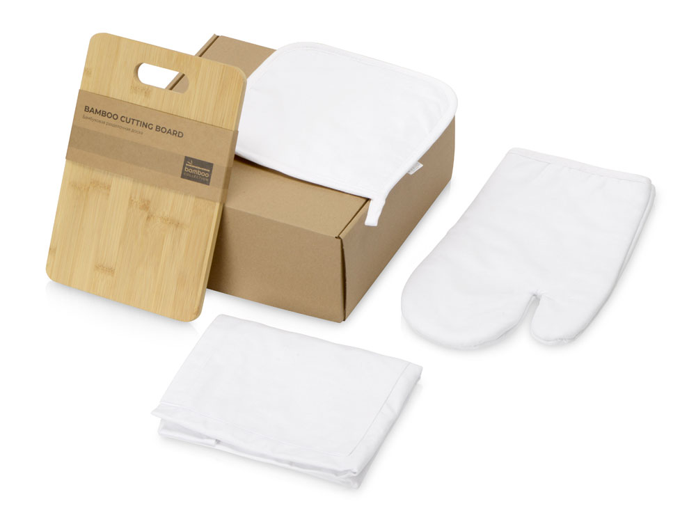 Подарочный набор Brand Chef Plus состоит из фартука, прихватки и рукавицы из хлопка, а также бамбуковой разделочной доски, поставляемых в крафтовой коробке. Фартук имеет карман на животе. Посадку фартука можно регулировать при помощи ремешка вокруг шеи. Бамбуковая разделочная доска идеально подходит для резки и красивой подачи блюд.